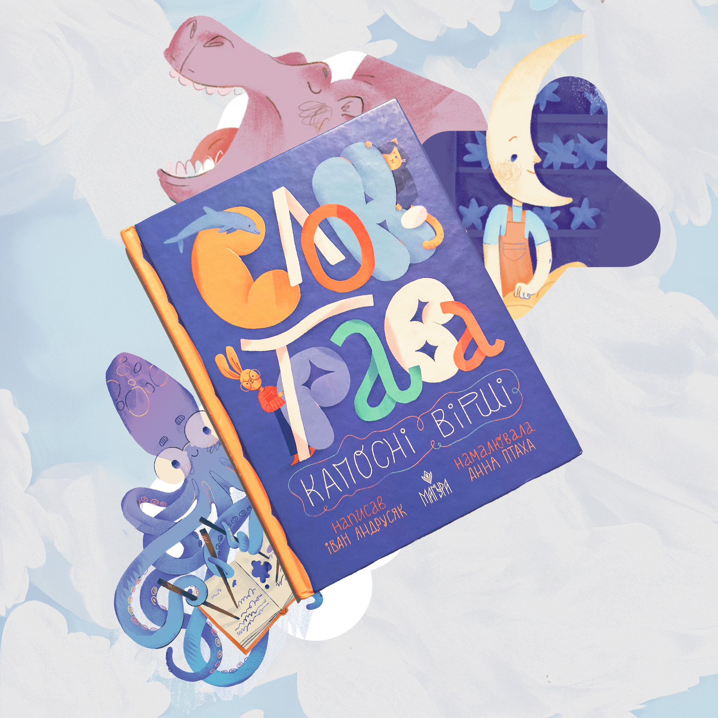 Ще одна збірка Івана Андрусяка – “Слон-трава. Капосні вірші”. Теж трохи на виріст. Якісь теми та жарти будуть зрозуміліші, звісно, пізніше. Але дитині двох-трьох років теж цікаво долучитися до цієї гри зі словами й сенсами, які часом сплітаються в графічні вірші. Це одне з перших видань молодого видавництва “Маґура”, а над ілюстраціями працювала Анна Птаха.