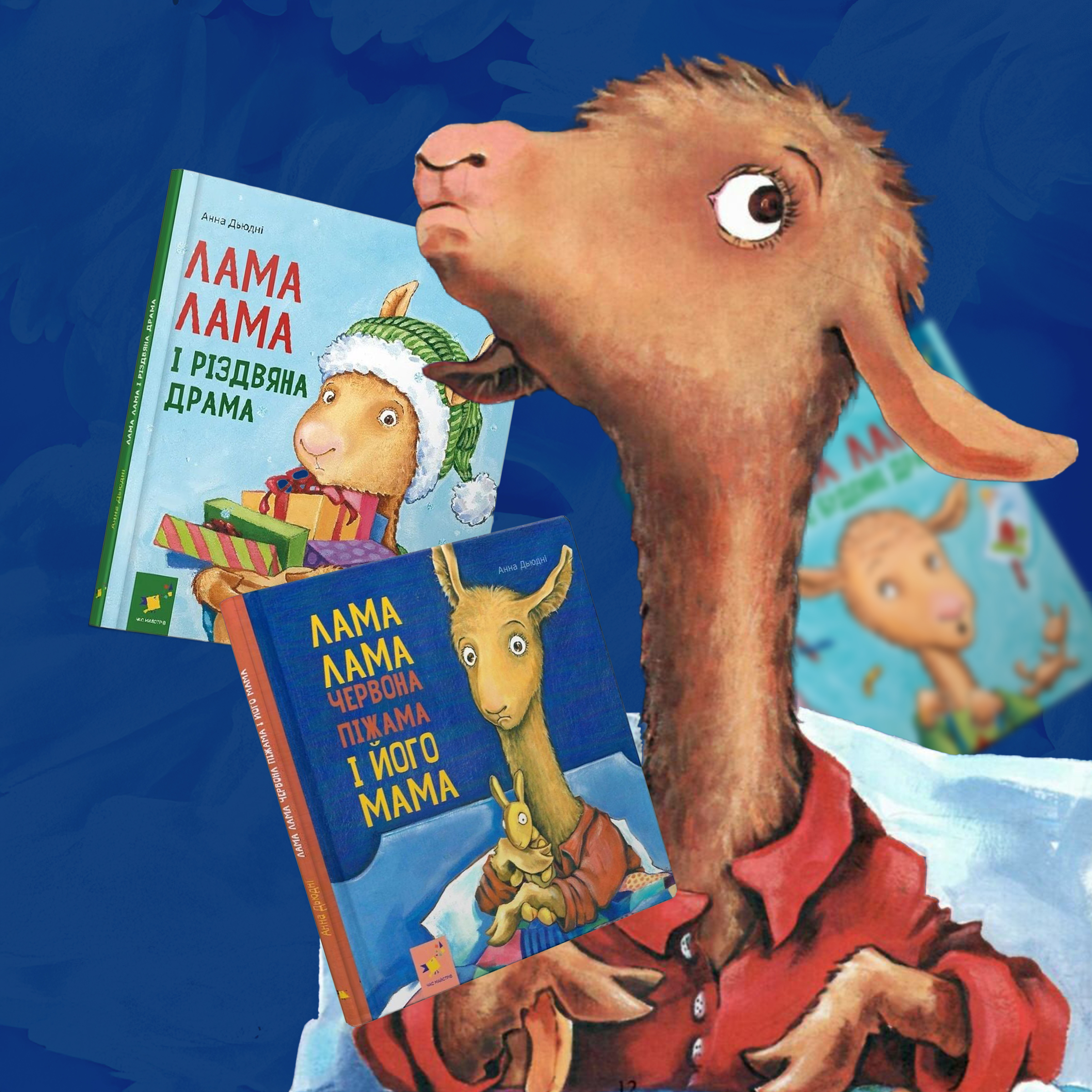 А я трохи розкажу ще про ламу Ламу. Це персонаж Анни Дьюдні в серії книжок, присвяченій його тривогам, радостям і відкриттям. Це легкі віршовані тексти на важливі теми. Малий лама Лама боїться залишатися сам у кімнаті, нудьгує у магазині, вчиться розуміти свої емоції, проявляти турботу, вчиться дружити, вперше йде до садочка, святкує Різдво і багато іншого.
