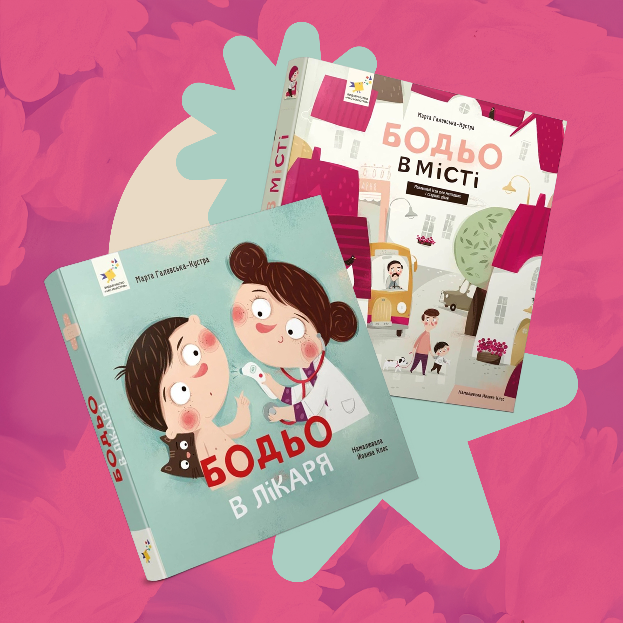 Тим часом не забудемо і про популярного Бодьо. Він росте і серія книжок про нього теж розростається новими гілочками і підтемами. Відтак маємо “Бодьо в місті”, де йдеться про те, як Бодьо, Мися і Бобо запрошують всю велику родину на сімейний обід та екскурсію до себе в місто. А ще – на виставку робіт тітки Ївги в галерею. Я нагадаю, що авторка історій про кмітливого хлопчика та його рідних –  Марта Галевська-Кустра – логопединя, яка в своїх текстах професійно піклується про розвиток мовлення та збагачення лексики малюків. Тут вам і слова на тему громадського транспорту, міського дозвілля, покупок, будівництва, найрізноманітніших побутових клопотів. Та навіть про безпеку руху – від катання на велосипеді в парку до серйозної ДТП на дорозі. На кожній сторінці ви знайдете запитання та завдання для діток орієнтовно за віком: до двох років, від трьох тощо. А ще тут винесені окремі слова та дії, які в ігровій формі можна відтворити та запам'ятати.  Додам також, що крім основної серії – “Бодьо вчиться говорити”, “Бодьо вимовляє перші слова”, “Бодьо вправляється в говорінні”, “Бодьо в місті”, “Бодьо в селі”, “Бодьо на канікулах” (цю ми ще не читали) – існує меньшформатна серія помічних книжок. Серед них – “Бодьо каже доброго ранку”, “Бодьо каже добраніч”, “Бодьо хоче пісяти або прощання з підгузком”, “Бодьо у лікаря” та інші. І як ви, думаю, здогадуєтеся, перші дві з них покликані доповнити ранкові і вечірні ритуали. “Доброго ранку” дає приклад того, як персонажі вітають новий день, чистять зубки, снідають, вдягаються тощо. А вечірня книжка розповідає, як Бодьо не міг заснути, а тато так його заговорив, що той і не помітив, коли солодко заснув. Про прощання з підгузком навіть не коментуватиму, її глобальна мета, думаю, надто очевидна.